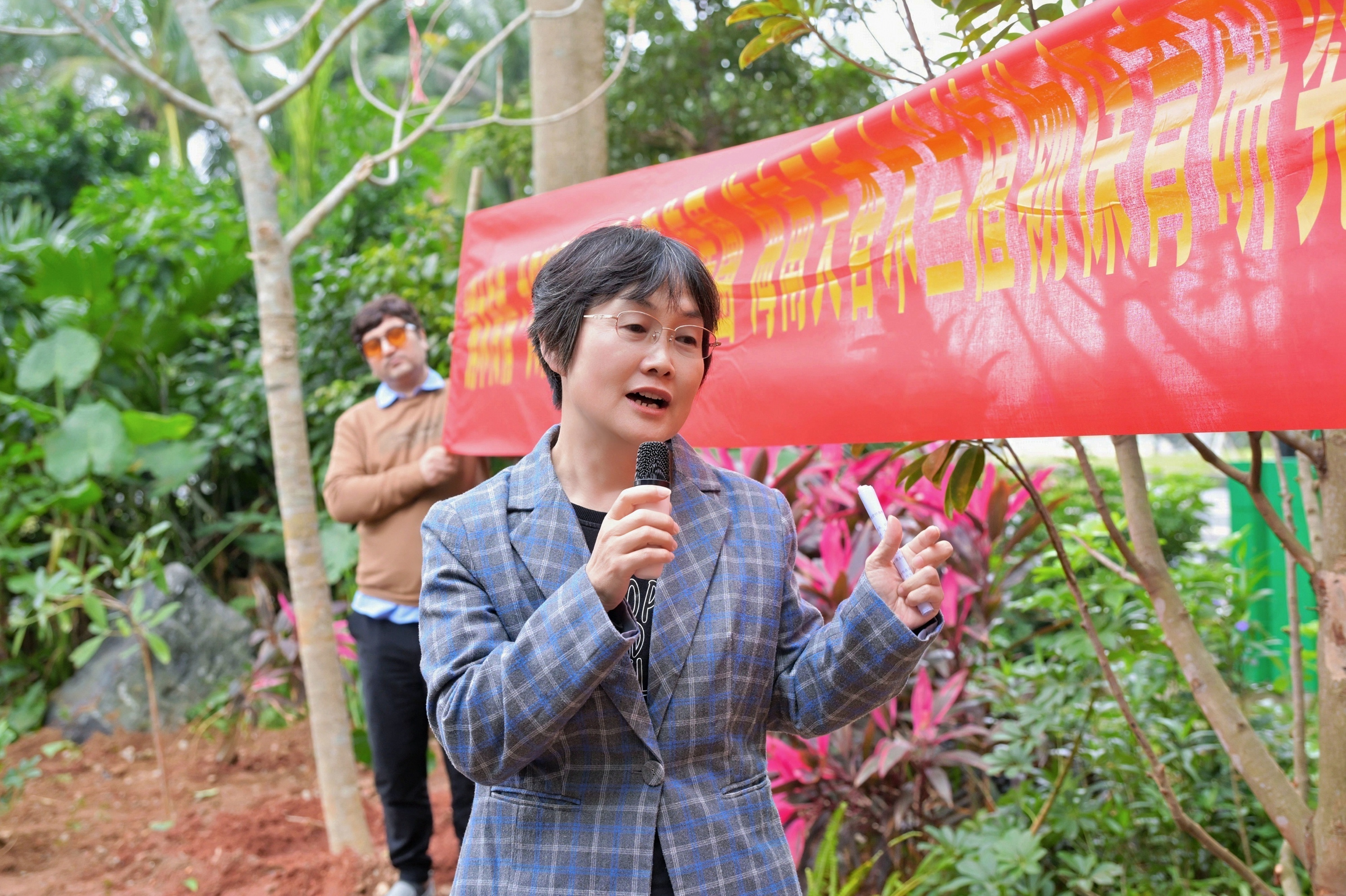 在植树环节,海南大学木兰首席研究员王亚玲现场讲解树木移栽的科学方法和养护要点,从挖坑、培土到浇水、支撑逐一细致示范。在她的指导下,与会嘉宾一同挥锹培土,合力种下珍稀木兰。研究院来自巴基斯坦的博士后扎曼同志也分享了自己在故乡种植树木的经验,表达了对生态文明建设的共同热忱。